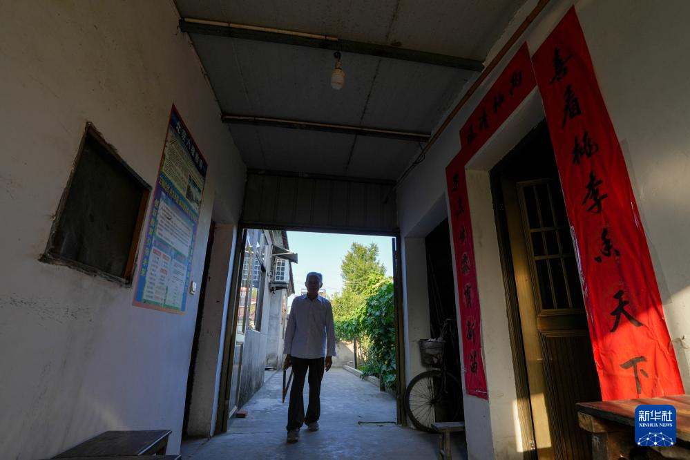 马如松老人来到家中的教室,教室门前贴着“喜看桃李系天下 乐洒甘霖育新苗”的对联(7月30日摄)。