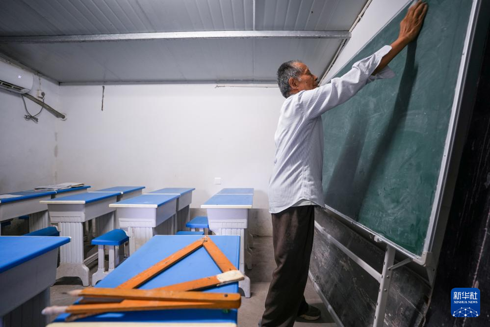 马如松老人课后在整理黑板(7月30日摄)。