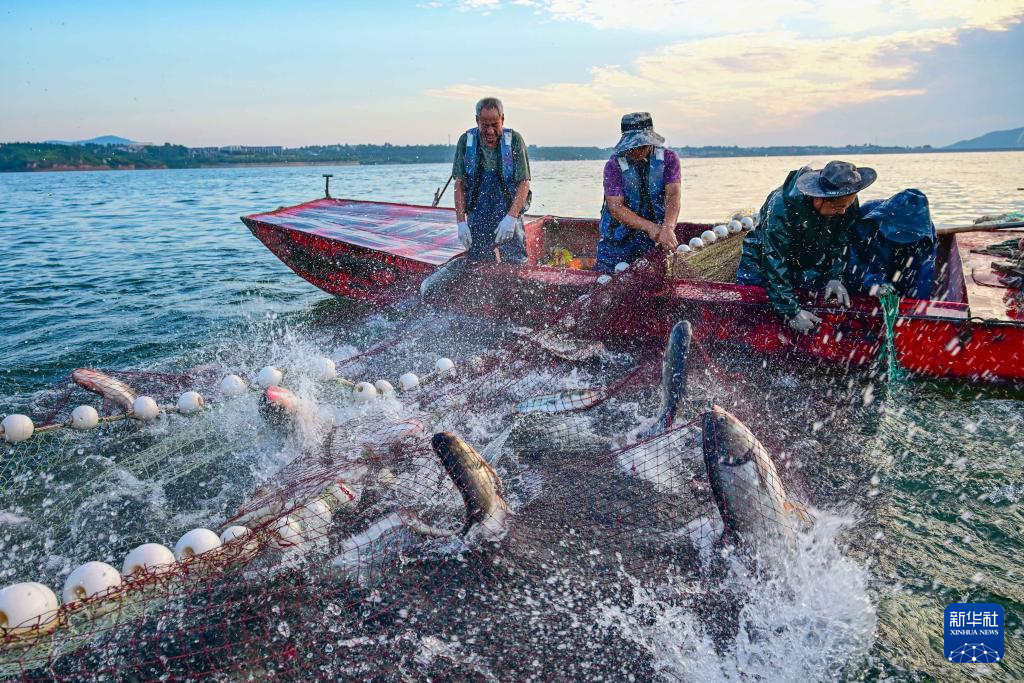 连日来,在河南省洛阳市嵩县陆浑湖,渔业工人冒着酷暑进行捕捞,湖面一派鱼跃人欢的丰收景象。