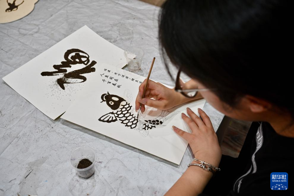 7月14日,浦源村鲤鱼溪画院内一名女孩在描绘鲤鱼画作。
