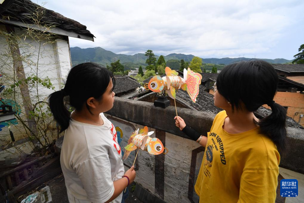 7月14日,浦源村鲤鱼溪画院内两名在此研学的大学生展示手工制作的鲤鱼灯。