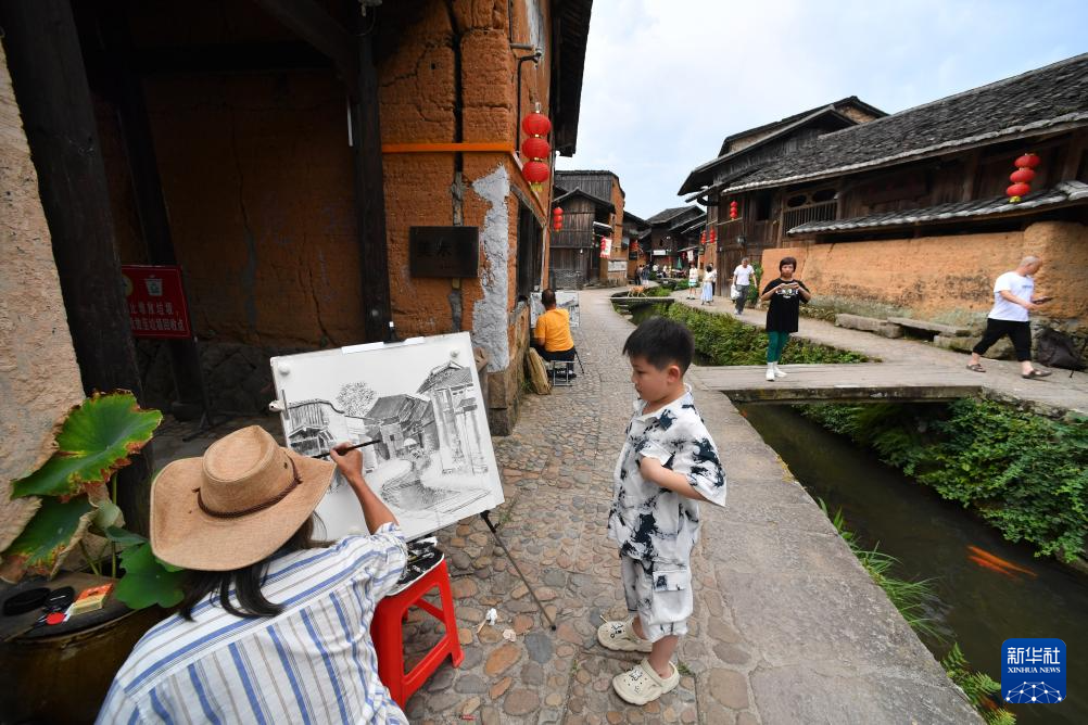 7月14日,浦源村鲤鱼溪景区内一名男孩在欣赏画家写生。