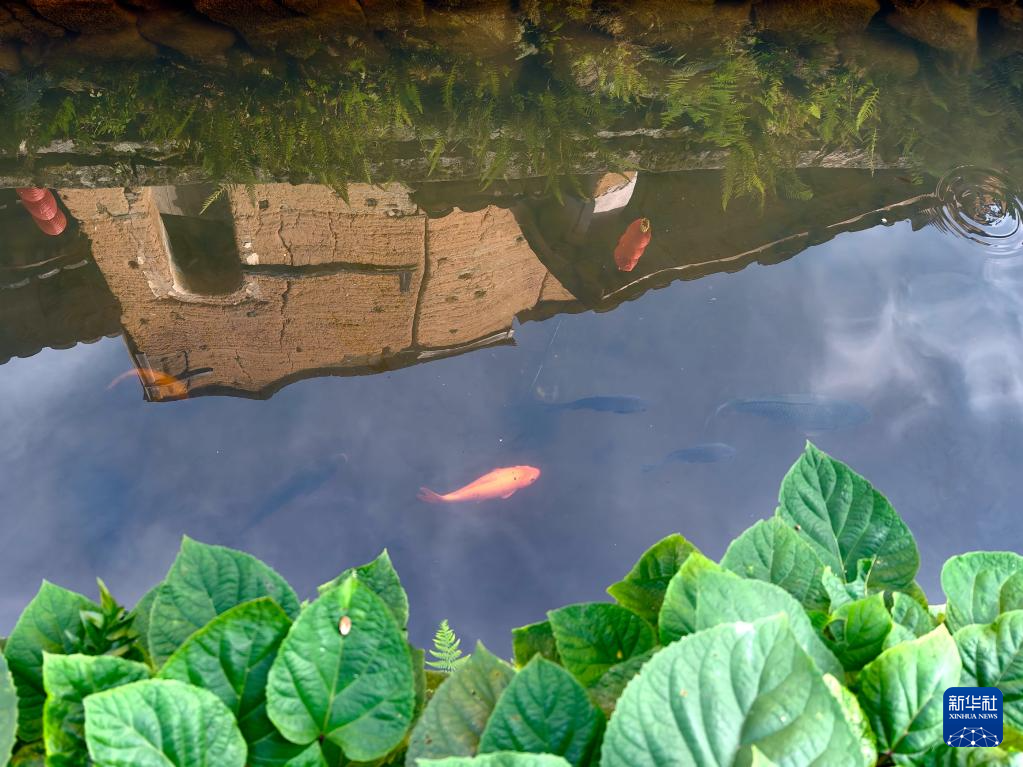 7月14日,浦源村鲤鱼溪内的鲤鱼与古民居倒影相映成趣。