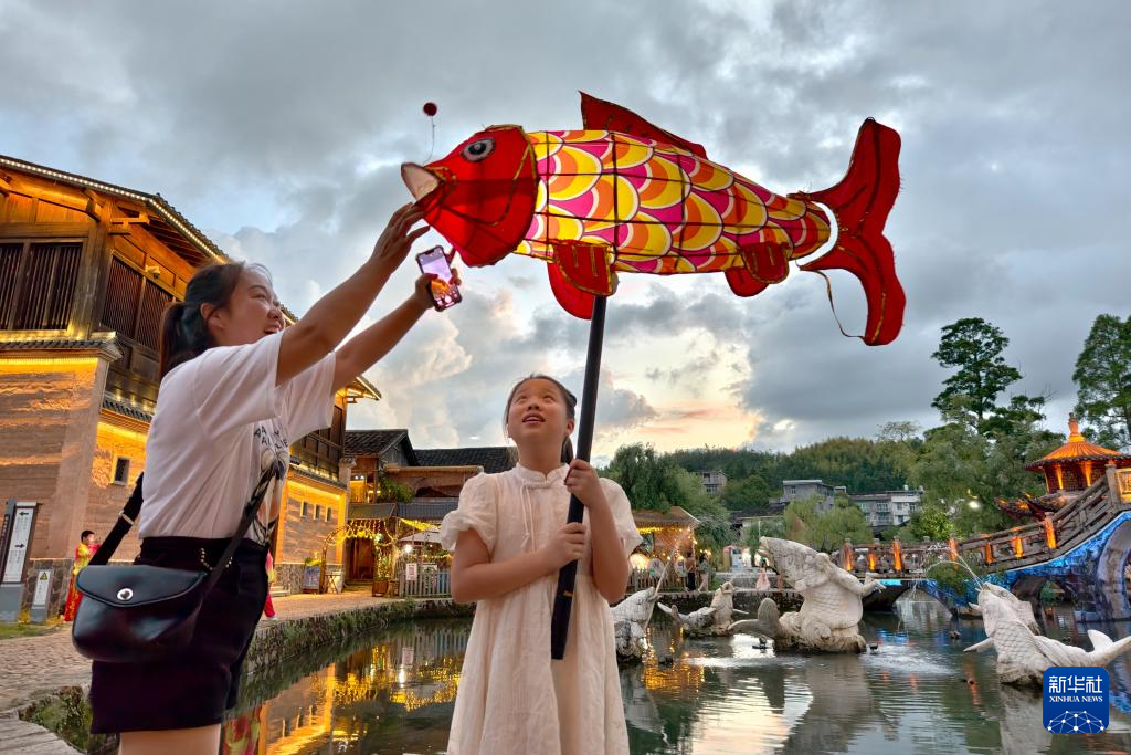 7月29日,一名小女孩在浦源村鲤鱼溪景区举起鲤鱼灯。