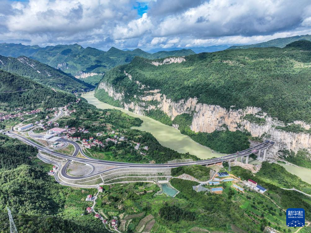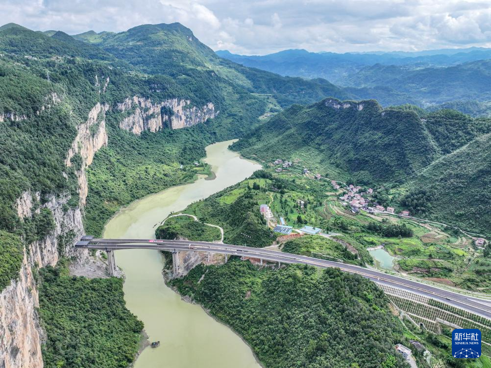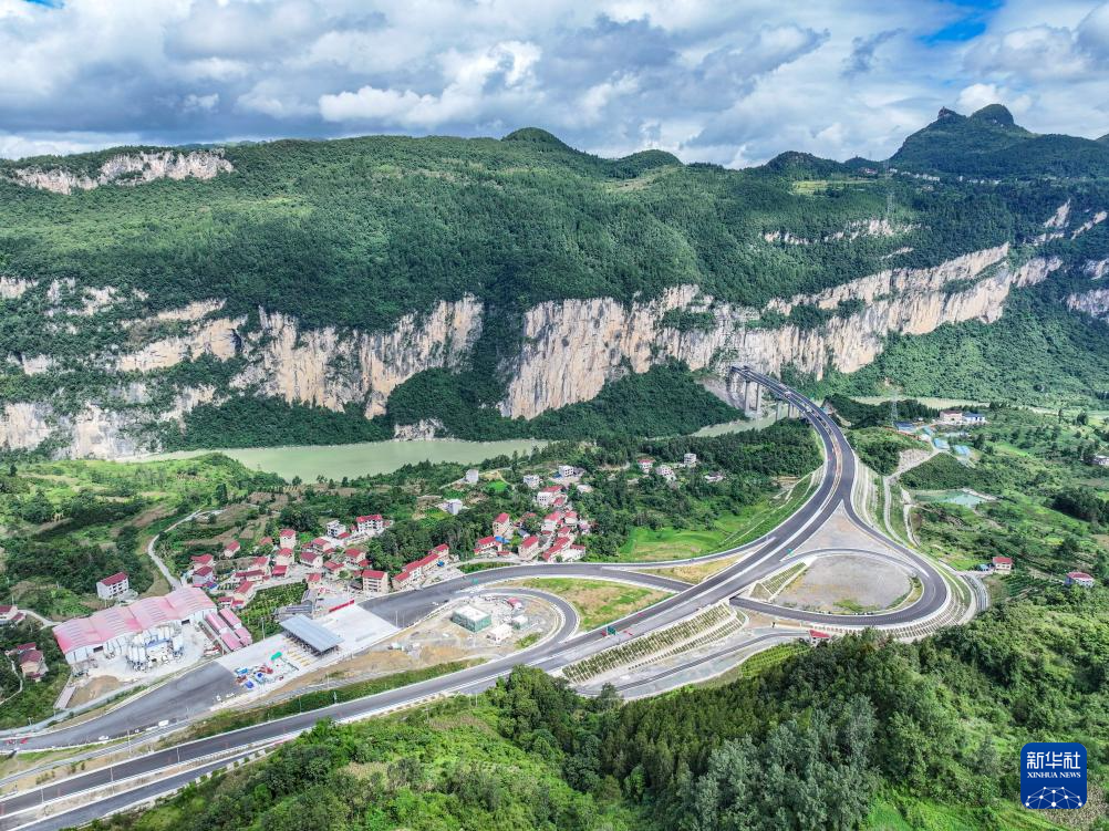 这是8月2日拍摄的渝湘复线高速彭酉路标段龚滩互通建设现场(无人机照片)。