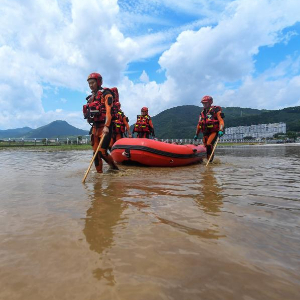 7月29日,临江市消防救援大队世纪大街站消防救援人员在临城村利用橡皮艇转运受困群众。