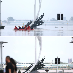 拼版照片:上图为7月30日在丹东市滨江中路拍摄的雕塑;下图为8月3日在丹东市滨江中路拍摄的雕塑。