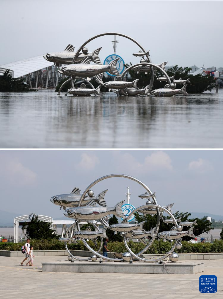 拼版照片:上图为7月30日在丹东市鸭绿江公园拍摄的雕塑(新华社记者姚剑锋摄);下图为8月3日在丹东市鸭绿江公园拍摄的雕塑(新华社记者龙雷摄)。
