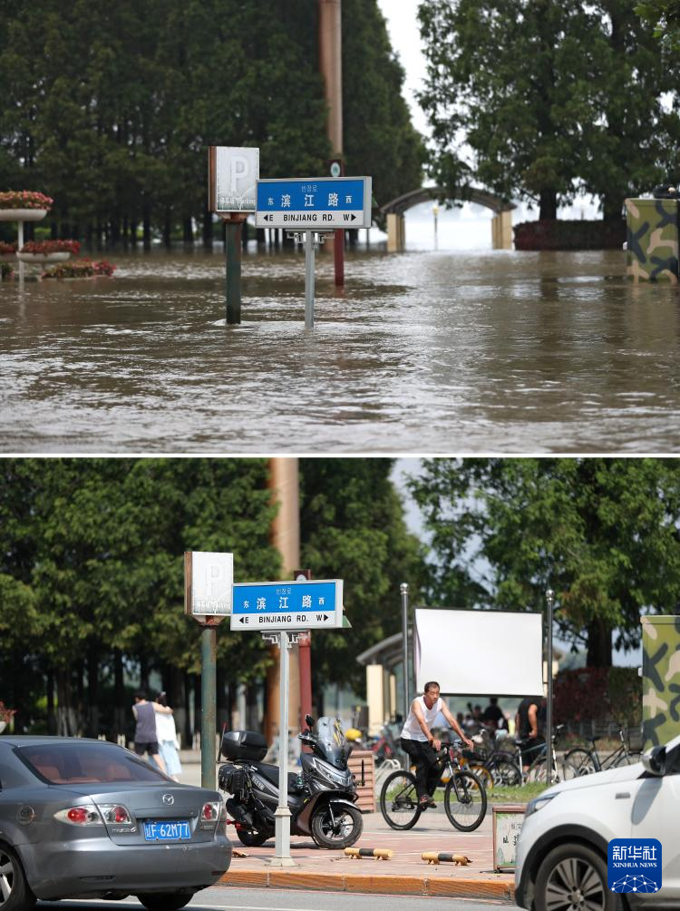 拼版照片:上图为7月30日在丹东市滨江中路拍摄的街景;下图为8月3日在丹东市滨江中路拍摄的街景。
