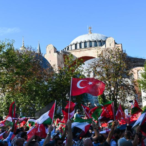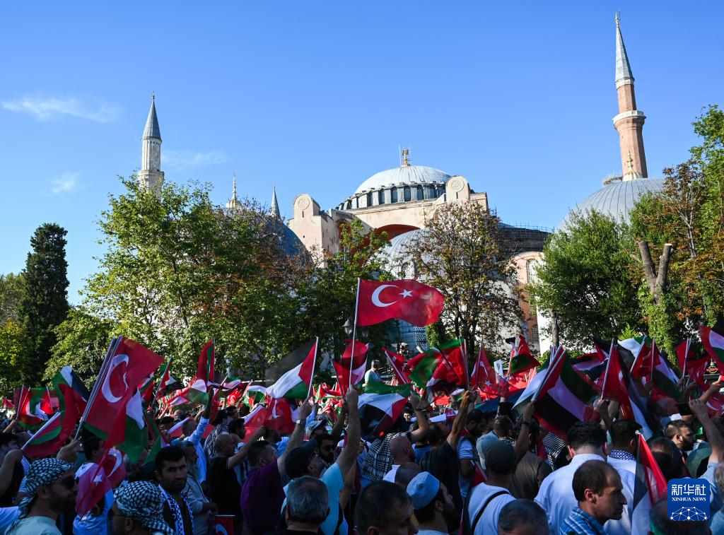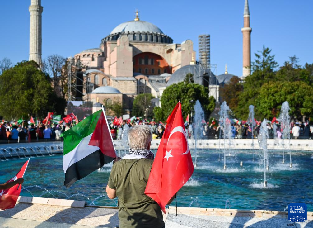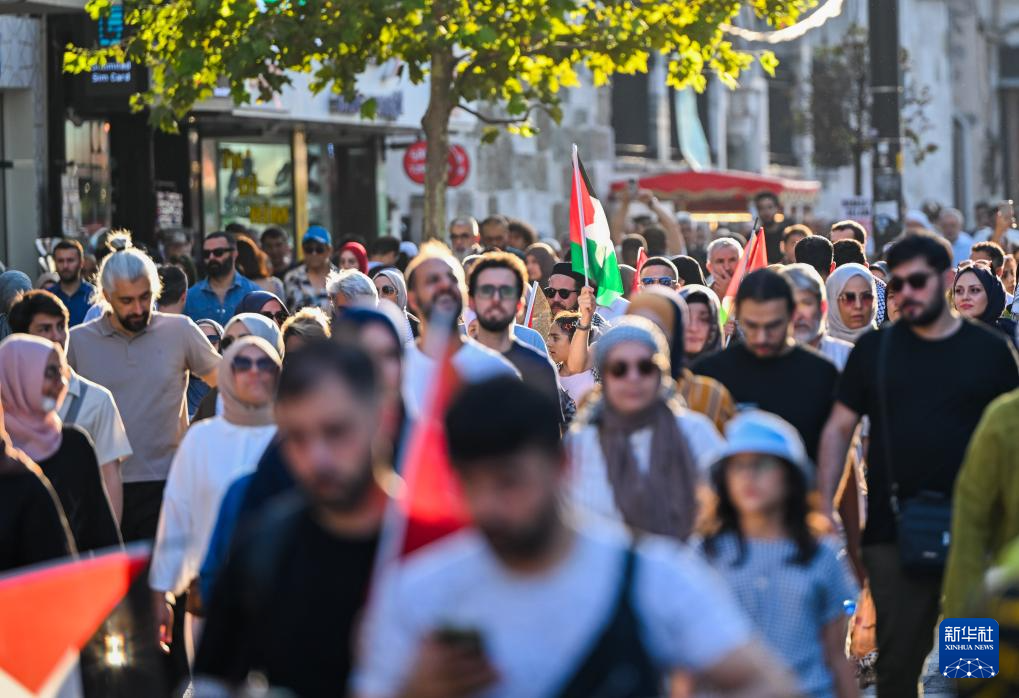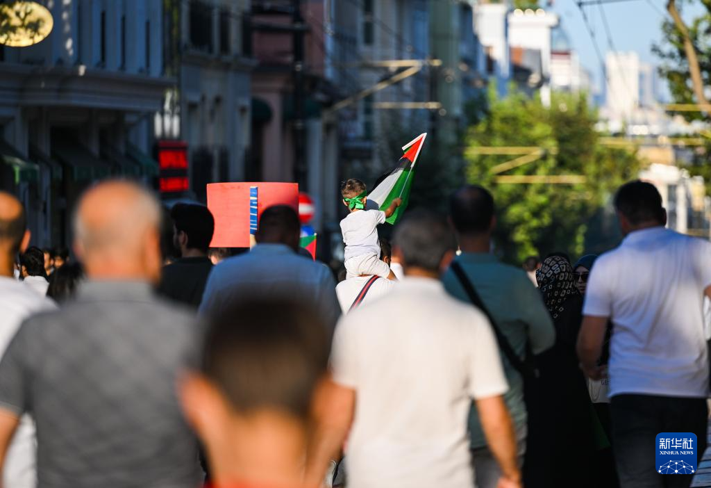8月3日,民众在土耳其伊斯坦布尔参加集会声援巴勒斯坦。