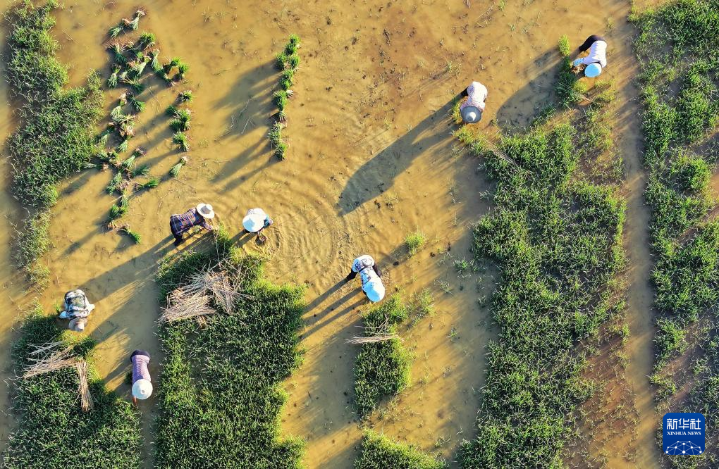 8月3日,衡东县草市镇村民开展晚稻插秧工作(无人机照片)。