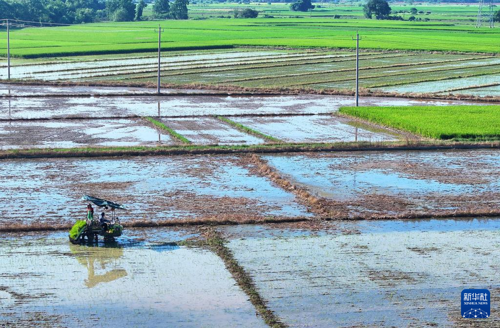 8月3日,衡东县草市镇村民驾驶农机开展晚稻插秧工作(无人机照片)。