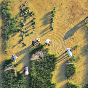 8月3日,衡东县草市镇村民在起秧苗(无人机照片)。