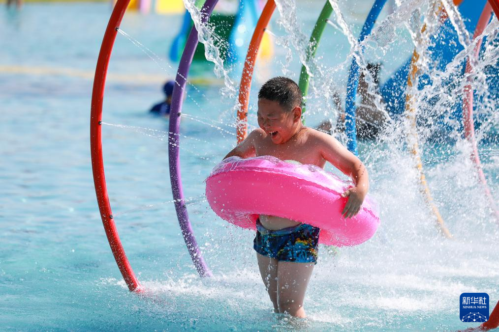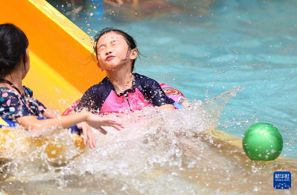 8月4日,小朋友在山东省滕州市新盈泰温泉度假村水上乐园戏水。