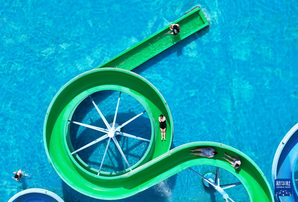 8月3日,游客在江苏扬州水上乐园戏水游玩(无人机照片)。