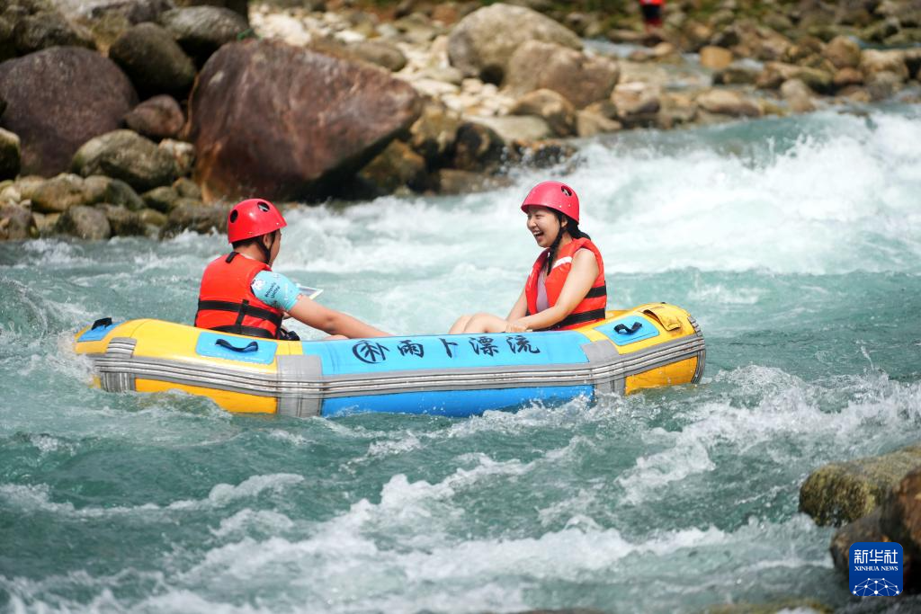 8月3日,在广西柳州市融水苗族自治县香粉乡雨卜村,游客乘坐皮筏漂流。