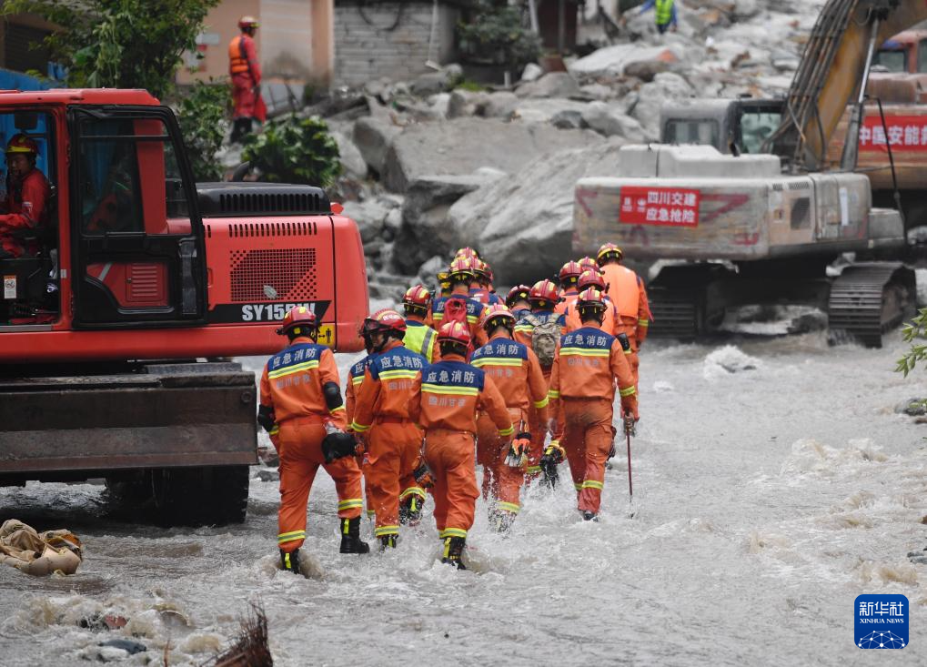8月4日,在四川甘孜州康定市姑咱镇日地村,救援人员搜救失联人员。