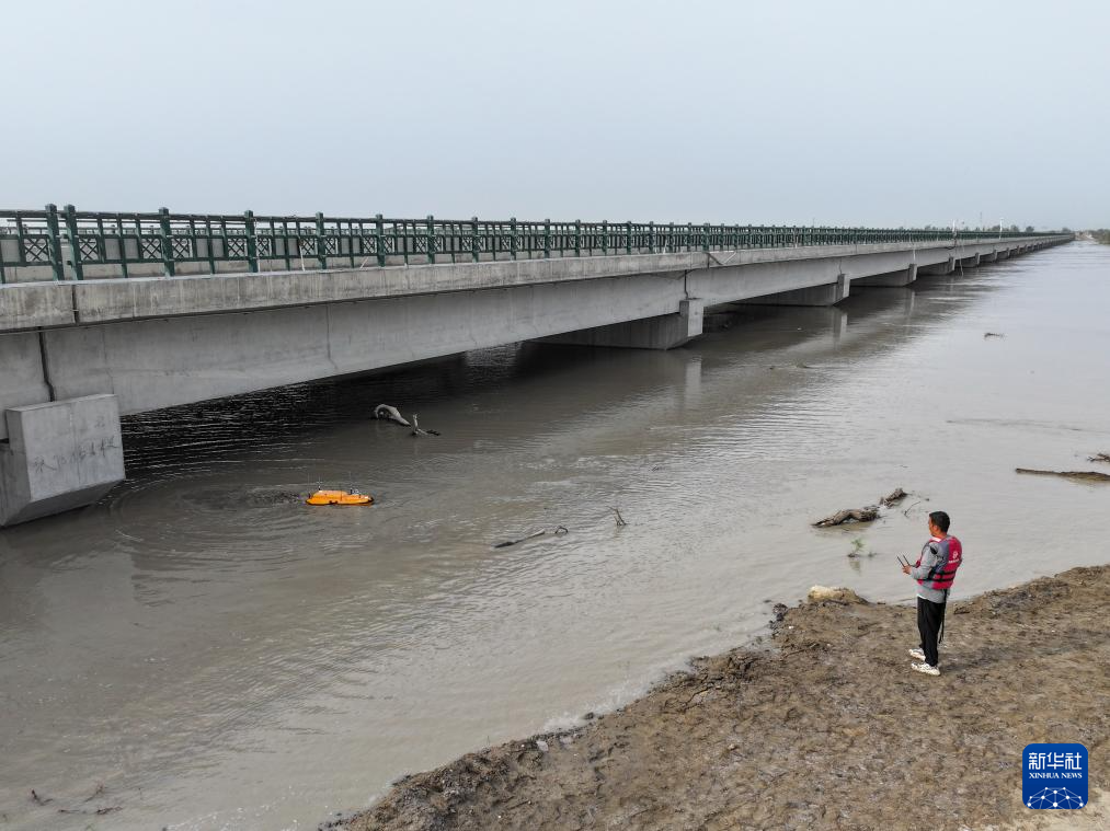 在新疆阿克苏地区沙雅县盖孜库木乡,阿克苏水文勘测局的工作人员在盖孜库木大桥防洪段收集水文信息(8月3日摄)。