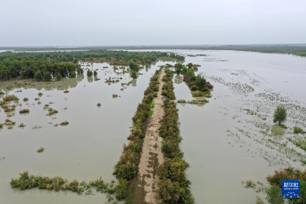 8月1日拍摄的利用塔里木河洪水灌溉阿克苏地区沙雅县天然胡杨林的场景(无人机照片)。
