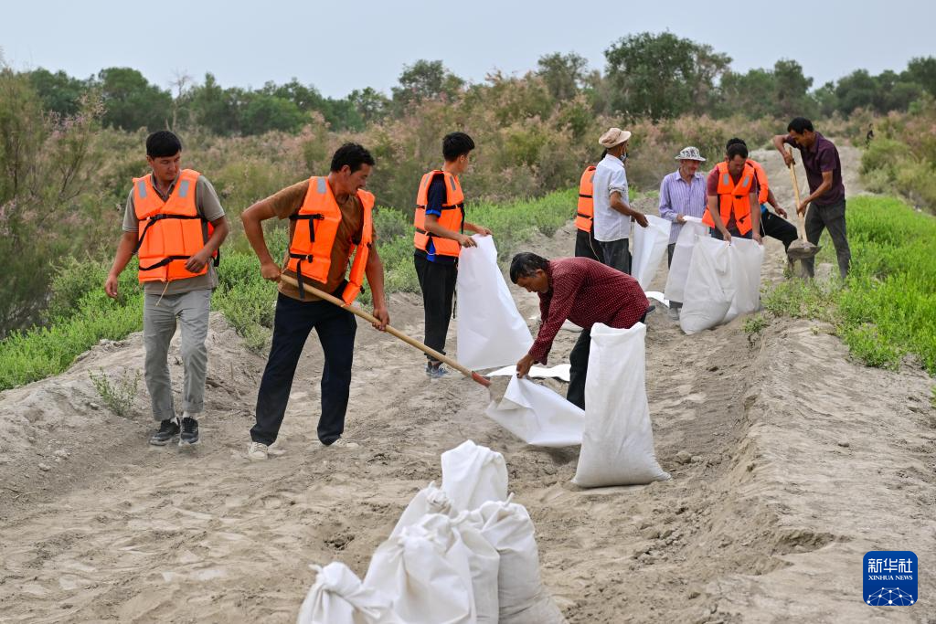 在新疆阿克苏地区沙雅县盖孜库木乡一处河堤除险加固现场,抢险人员在装运沙袋(8月3日摄)。