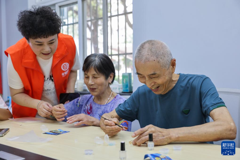 8月6日,志愿者指导龙泉街道潜庄社区居民制作七彩螺钿蝴蝶胸针。