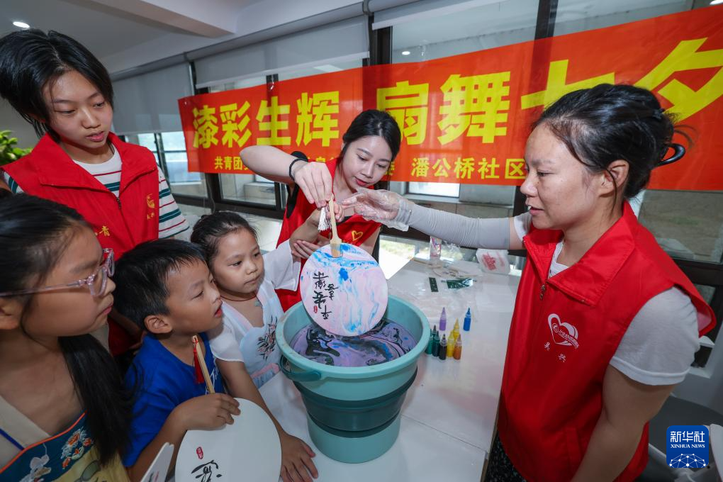 8月6日,龙泉街道潘公桥社区志愿者指导小朋友制作漆扇。