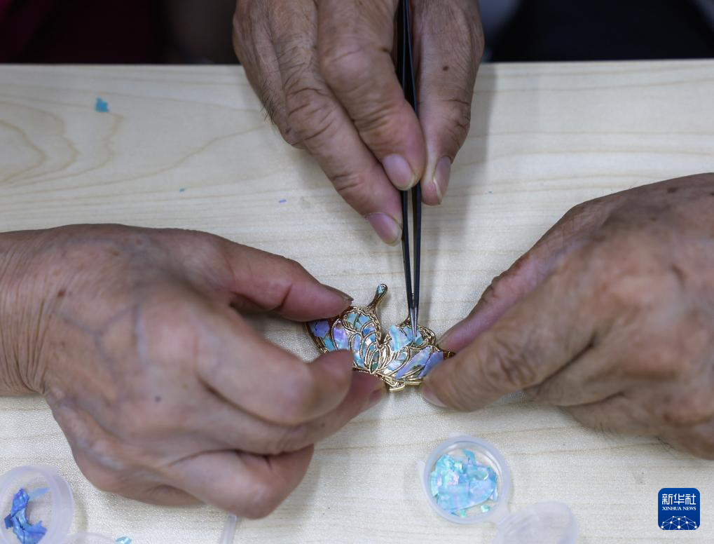 8月6日,龙泉街道潜庄社区居民在制作七彩螺钿蝴蝶胸针。