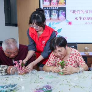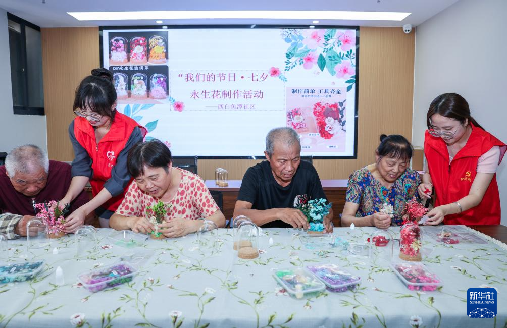 8月6日,龙泉街道西白鱼潭社区志愿者指导社区居民制作永生花。
