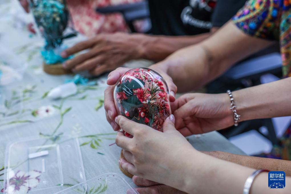 8月6日,龙泉街道西白鱼潭社区居民在制作永生花。