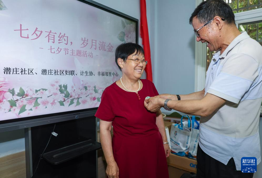 8月6日,龙泉街道潜庄社区居民汤菊生(右)把制作好的七彩螺钿蝴蝶胸针作为七夕特色礼物送给妻子张正锡。