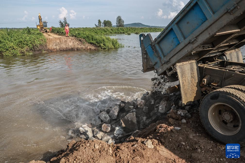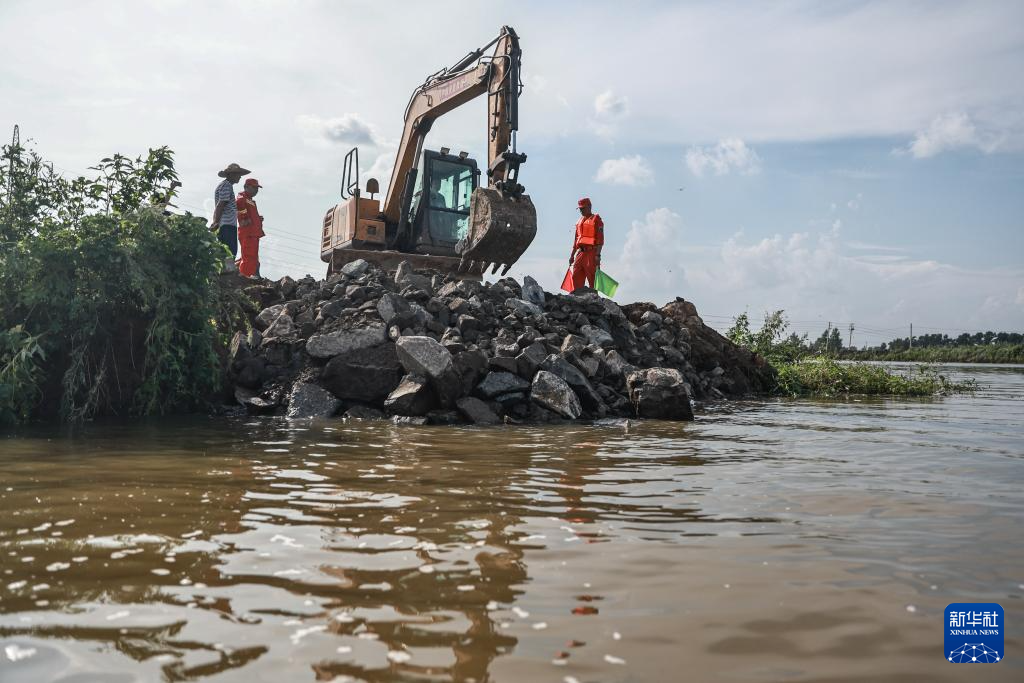 8月6日,抢险人员指挥大型机械在溃口处进行封堵作业。
