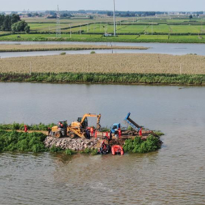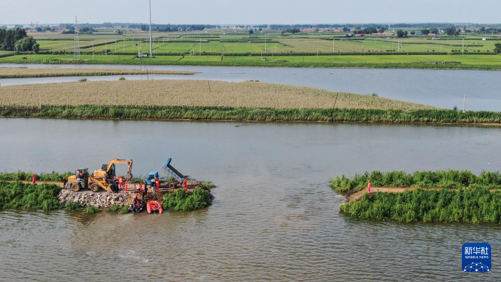 8月6日,抢险人员在王河溃口处进行封堵工作(无人机照片)。