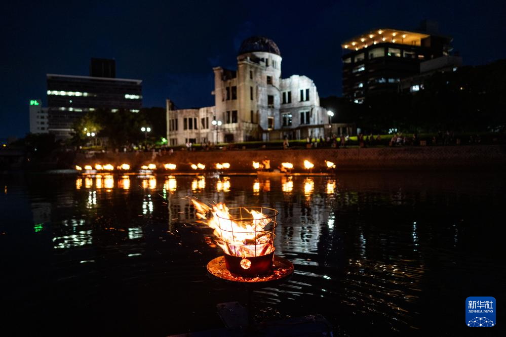 8月5日晚,在日本广岛和平纪念公园,写满祝福话语的木条被放在河中漂浮的火盆中,以纪念原子弹轰炸受害者。