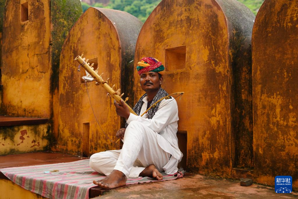 8月5日,表演者在印度斋浦尔“琥珀堡”演奏印度传统乐器。