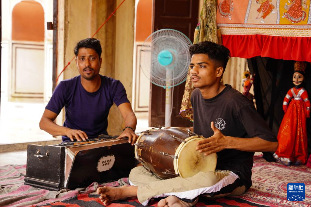 8月5日,表演者在印度斋浦尔“风之宫”演奏印度传统乐器。