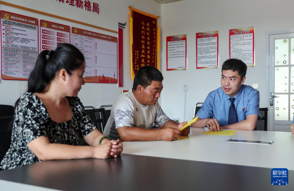 8月7日,辽宁阜新蒙古族自治县人民检察院检察人员在于寺镇官营子村向村民发放普法宣传材料。