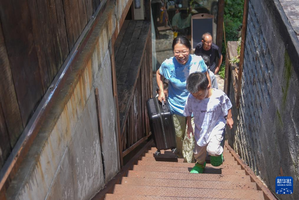 8月6日,在神农架林区红花坪村,民宿经营者韦群帮住客搬运行李。韦群是土生土长的神农架人。2020年,她在红花坪村盘下了一栋夯土房,经过一年时间,将其打造成了一座具有9间客房,配备餐厅、茶室、书屋以及制茶屋、熏肉房和扎染作坊的别具文化特色的民宿。