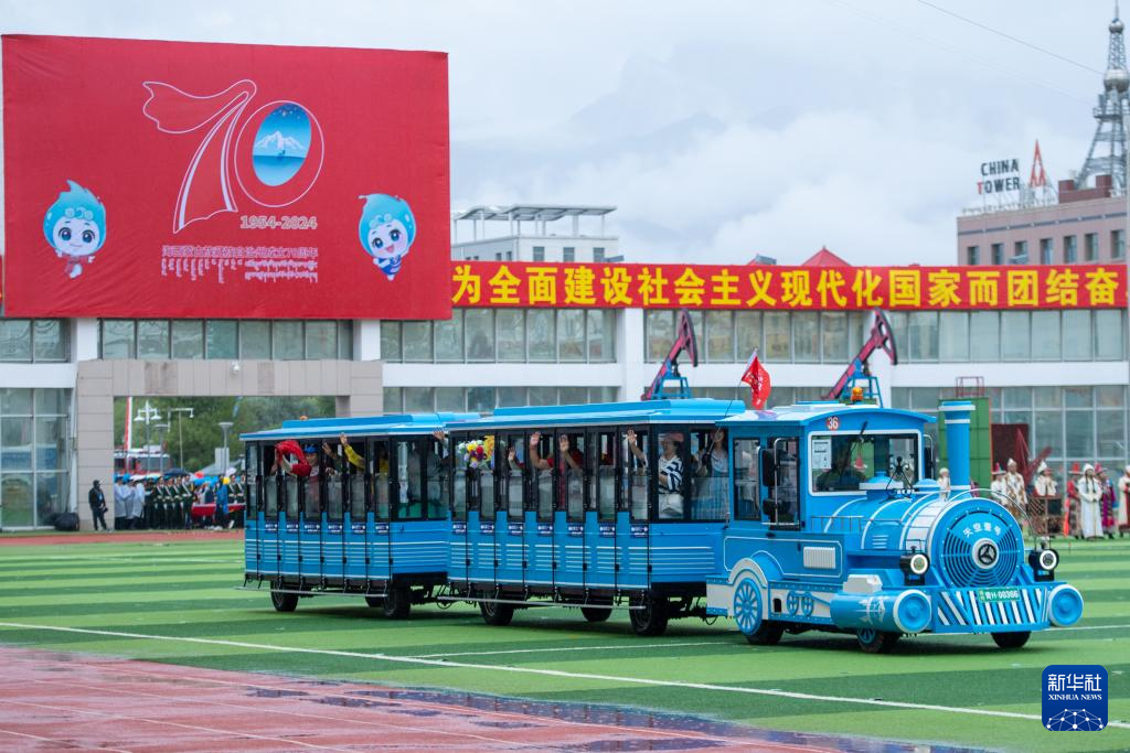 8月8日,在海西蒙古族藏族自治州德令哈市,演员在文艺展演活动上乘坐道具小火车上场。