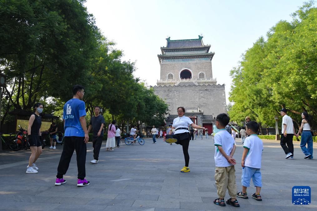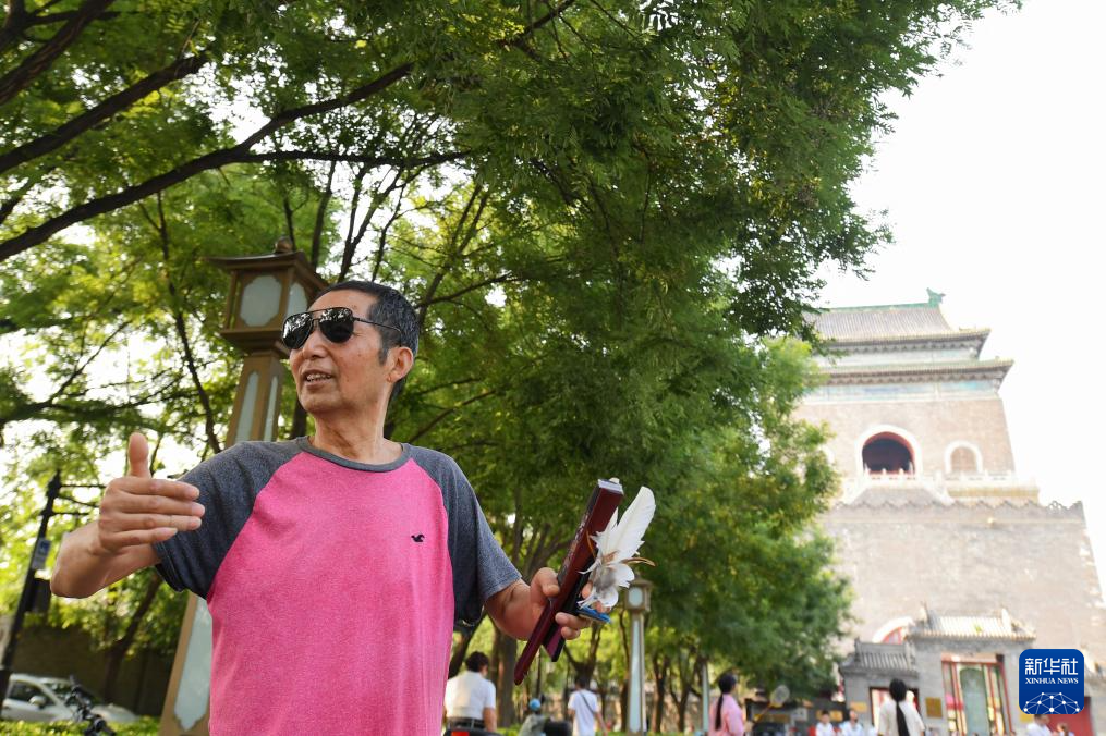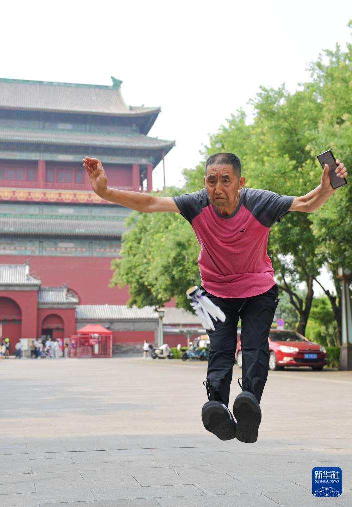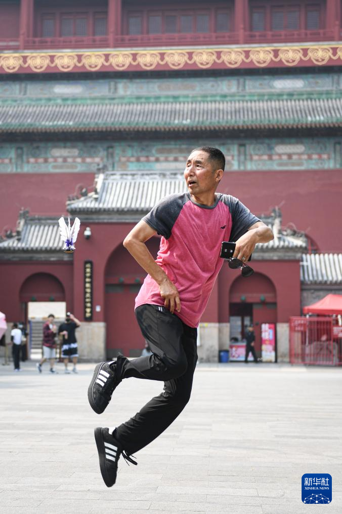 7月10日,范来友在北京钟鼓楼广场上踢毽子。69岁的范来友是钟鼓楼下有名的踢毽高手,他曾在钟鼓楼见证过北京奥运会开幕式倒计时“大脚印”,还参与过撞钟迎冬奥活动。