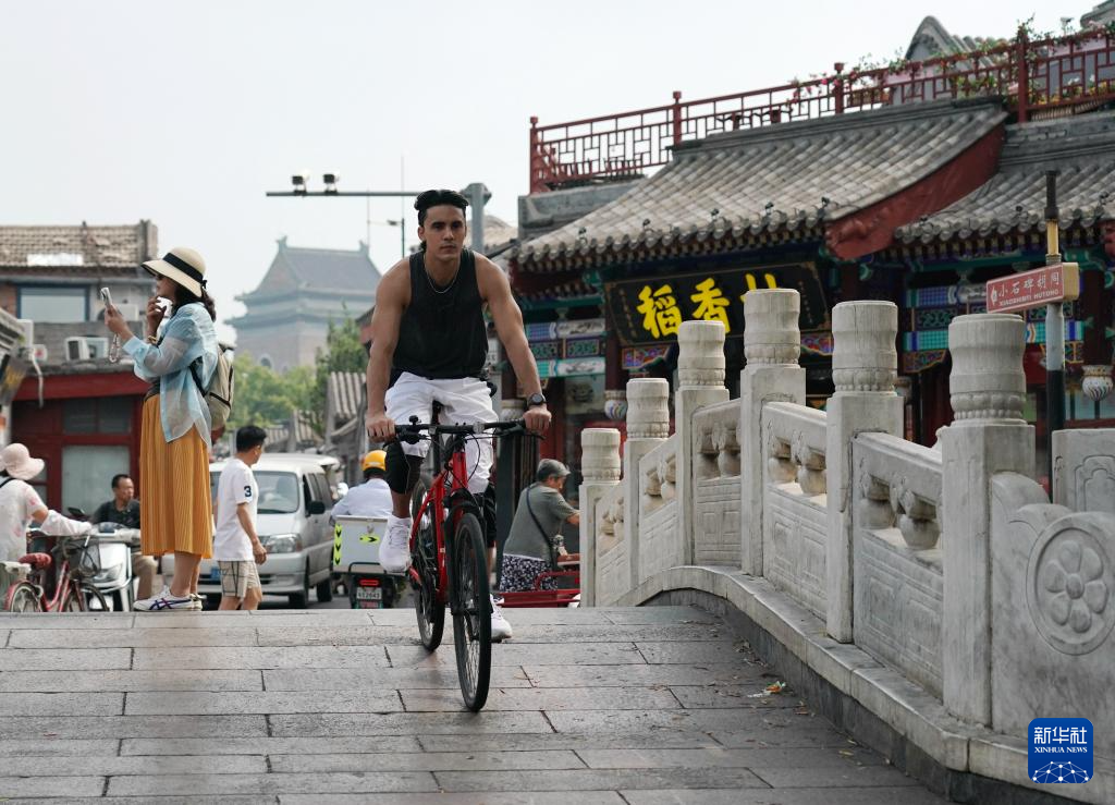 6月30日,兰佩丝在北京什刹海地区骑行游玩时经过银锭桥。法国人兰佩丝在北京生活工作多年,他是一名计算机工程师,同时也是一名马拉松爱好者,每周都会到奥森公园进行训练。