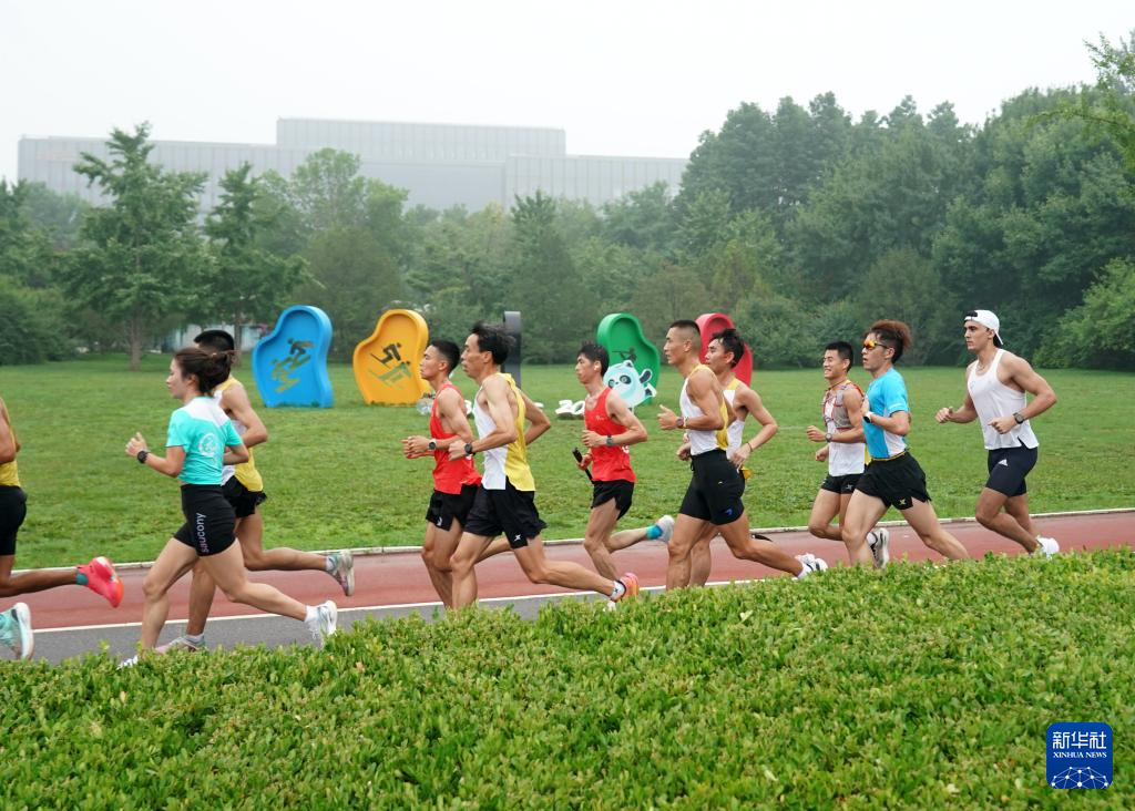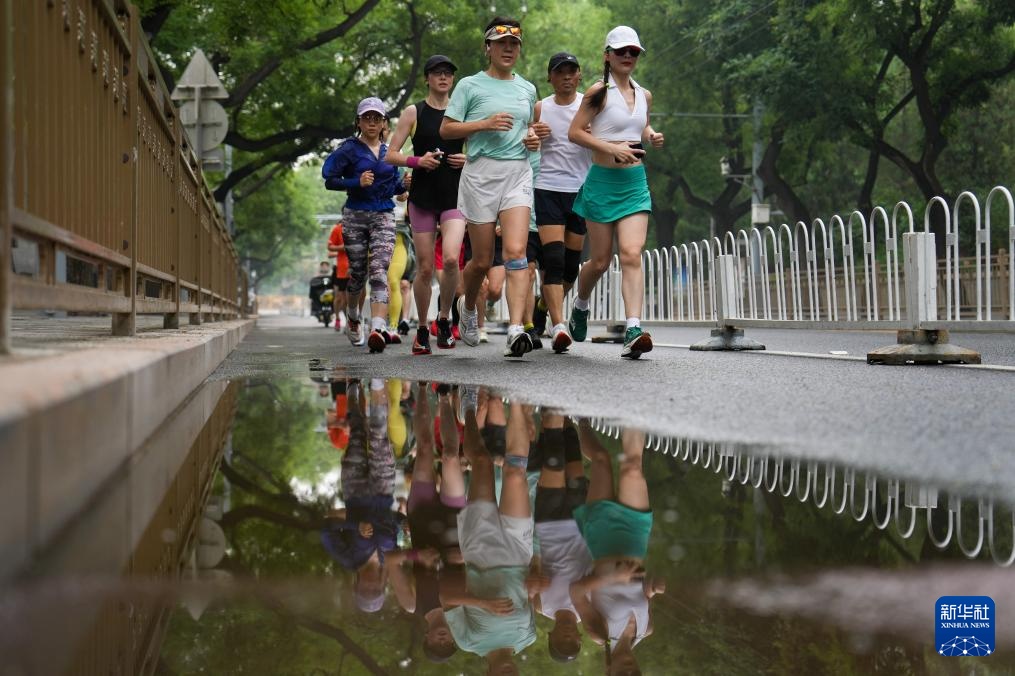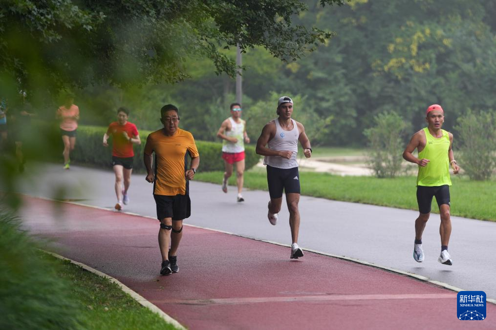 7月14日,兰佩丝(右一)与跑团的队友在北京奥林匹克森林公园内训练。法国人兰佩丝在北京生活工作多年,他是一名计算机工程师,同时也是一名马拉松爱好者,每周都会到奥森公园进行训练。