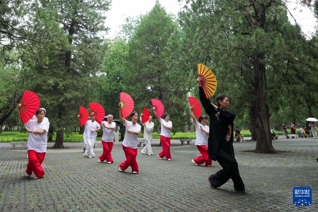 7月2日,在北京天坛公园,杨淑芹(右)带领学员练习太极功夫扇。杨淑芹是国家级社会体育指导员,每天清晨都在这里向学员教授太极拳、太极扇等传统体育健身项目,至今已有28年。