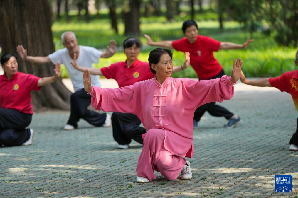 6月28日,在北京天坛公园,杨淑芹(前)带领学员练习健身气功。杨淑芹是国家级社会体育指导员,每天清晨都在这里向学员教授太极拳、太极扇等传统体育健身项目,至今已有28年。