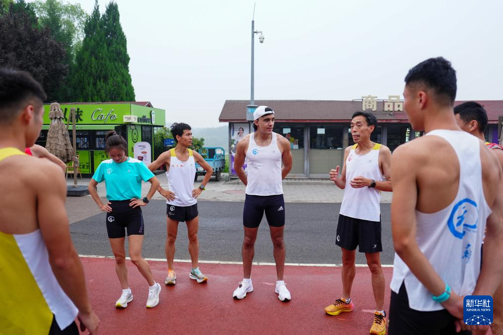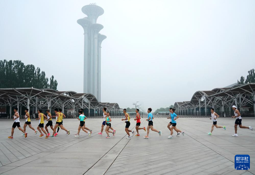 7月14日,在北京奥林匹克森林公园,兰佩丝(中)和跑团队友准备开始训练。法国人兰佩丝在北京生活工作多年,他是一名计算机工程师,同时也是一名马拉松爱好者,每周都会到奥森公园进行训练。