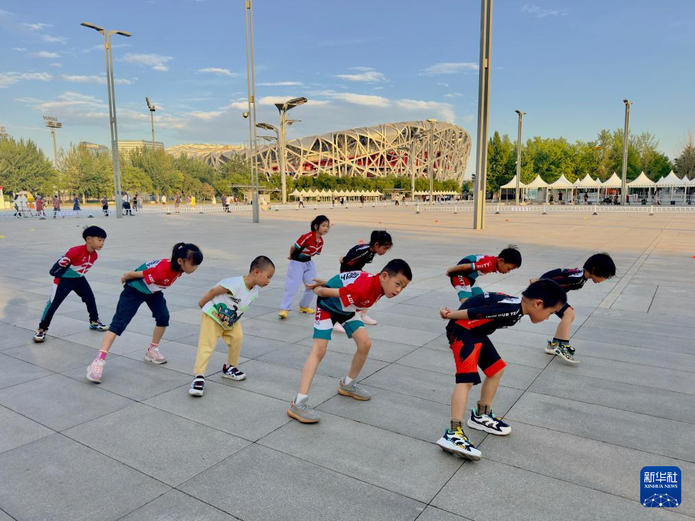 6月25日,小朋友们在国家体育场“鸟巢”前的轮滑公园练习轮滑。
