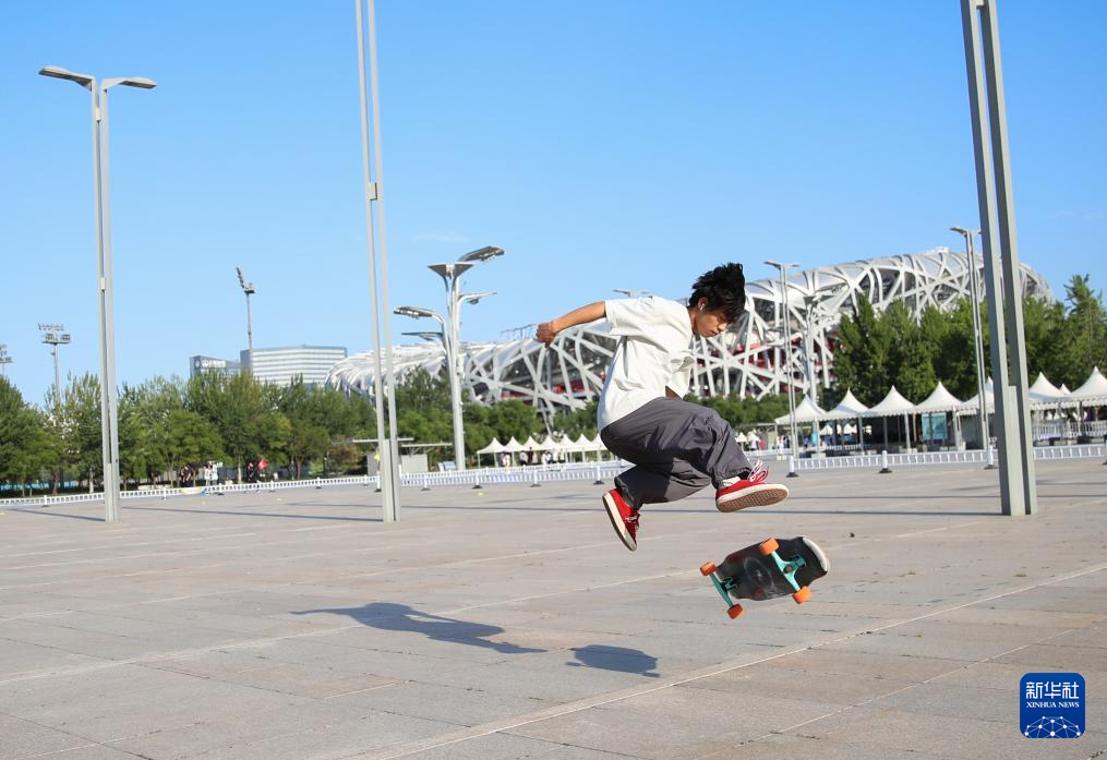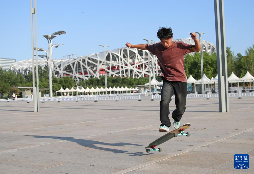 6月25日,滑板职业教练杨腾达在北京奥林匹克公园内练习滑板动作。