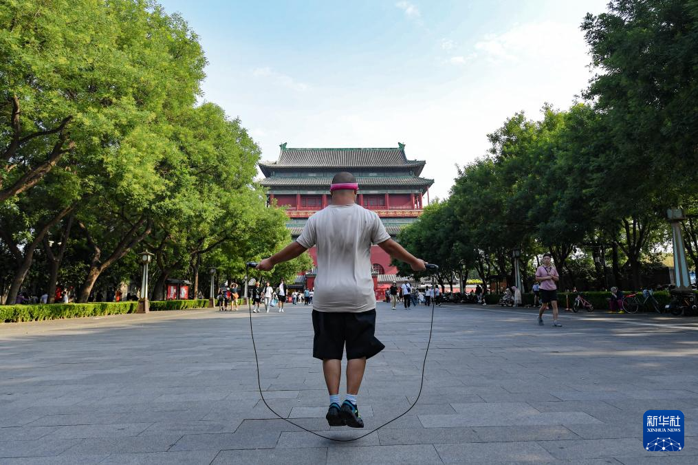 7月3日,一位健身爱好者在北京钟鼓楼广场上跳绳。