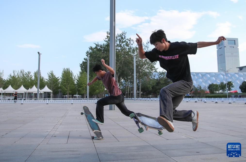 6月25日,滑板职业教练杨腾达(左)和王仕宇在北京奥林匹克公园内练习滑板动作。