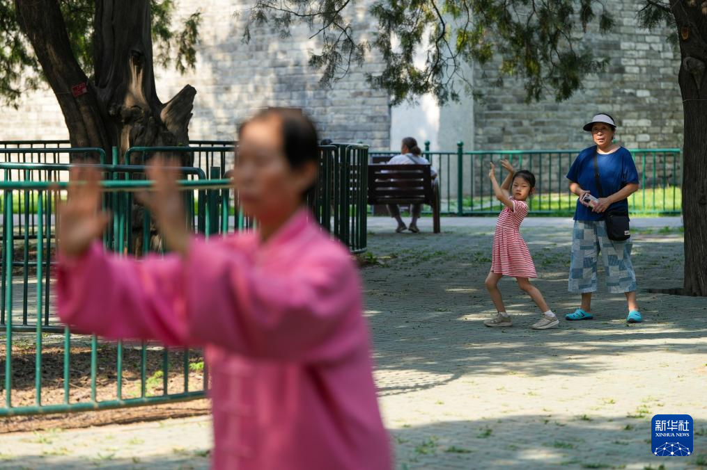 6月28日,在北京天坛公园,一位小朋友在模仿杨淑芹练习太极拳。杨淑芹是国家级社会体育指导员,每天清晨都在这里向学员教授太极拳、太极扇等传统体育健身项目,至今已有28年。