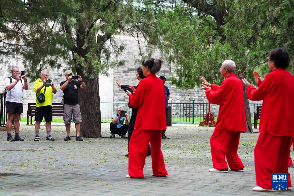 7月2日,在北京天坛公园,几位外国游客在观看杨淑芹带领学员练习太极拳。杨淑芹是国家级社会体育指导员,每天清晨都在这里向学员教授太极拳、太极扇等传统体育健身项目,至今已有28年。